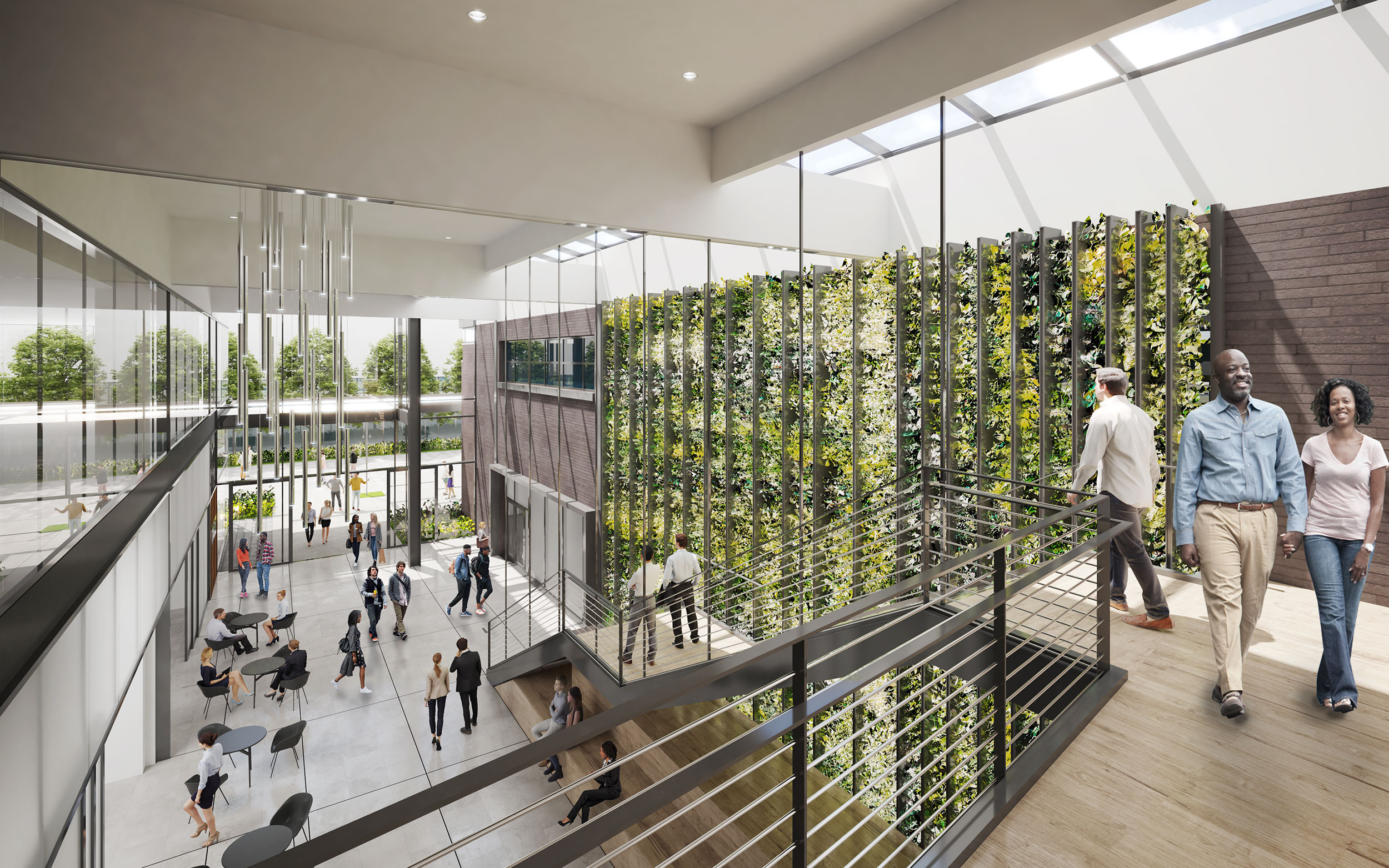 A formal gathering space that accommodates special events and encourages social interaction. The landscape will be a blend of hard and soft surfaces and complement the building lobby.