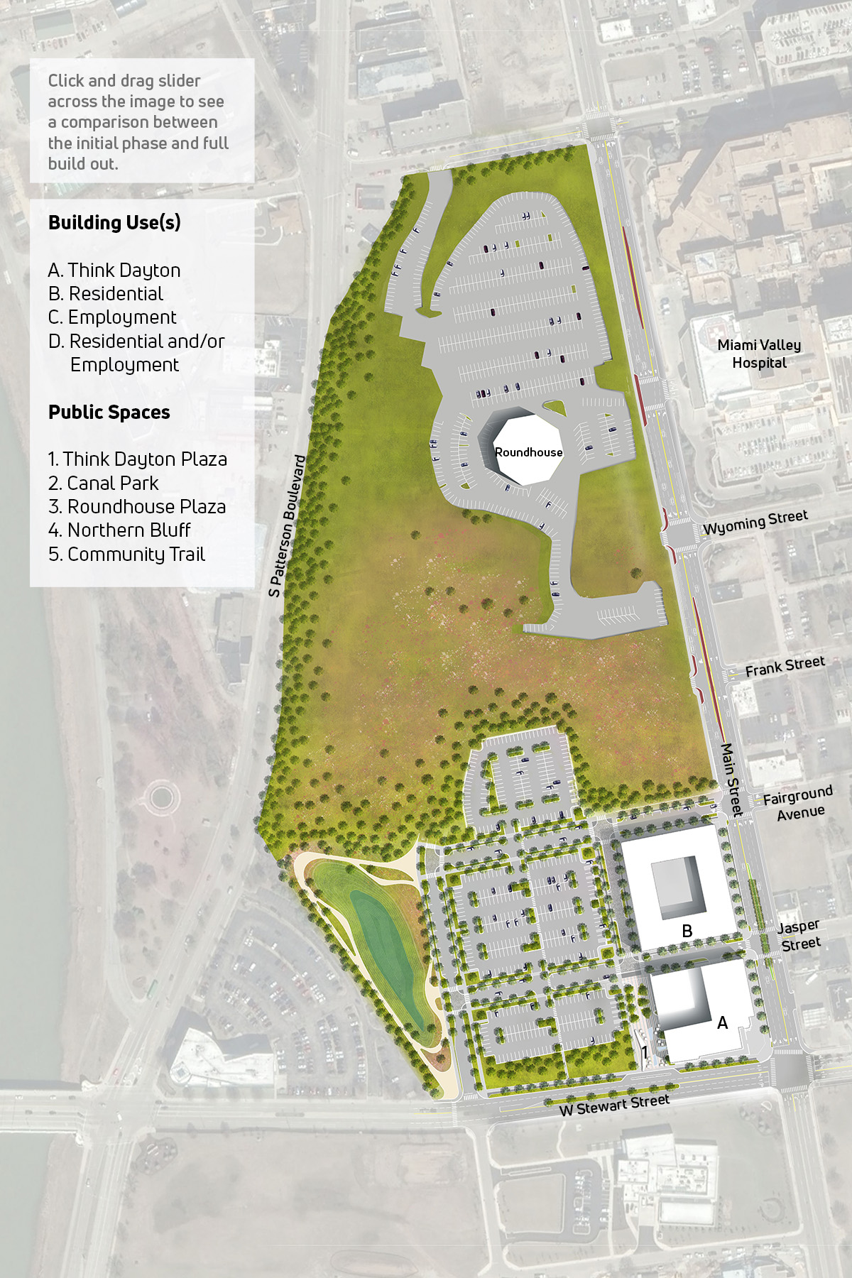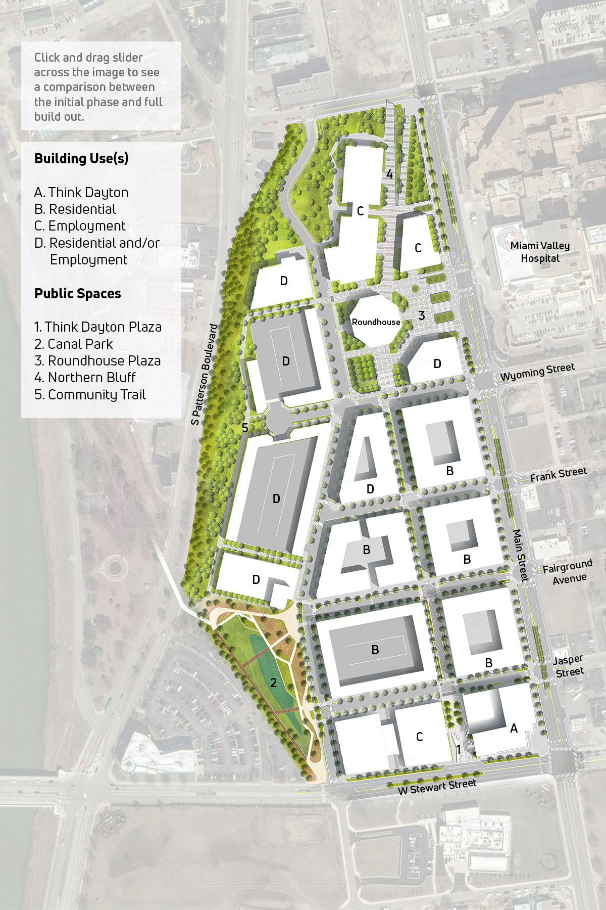 The initial phase begins along Stewart Street and Main streets, moving west and north and continues to complete the Stewart Street frontage and the development of Canal Park. To catalyze development activity, an employment-oriented building called the Think Dayton building is envisioned at Stewart and Main Street and the first residential building will be developed along Main Street. After the initial phase, market conditions and being responsive to opportunities will ultimately drive the phasing and timing for the build out of the site.